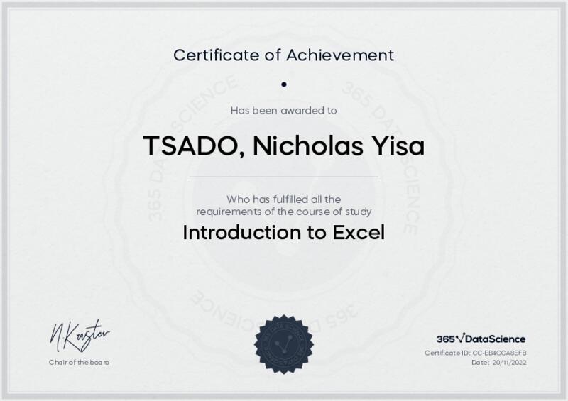 This user has been awarded the Introduction to Excel Certificate for successfully completing the course exam. Holding this certificate demonstrates their proficiency on the topic and signifies they are qualified to apply their newly acquired expertise in the fields of data analytics and data science.