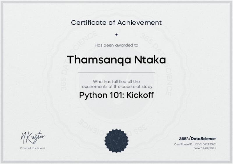 This user has been awarded the Python 101: Kickoff Certificate for successfully completing the course exam. Holding this certificate demonstrates their proficiency on the topic and signifies they are qualified to apply their newly acquired expertise in the fields of data analytics and data science.