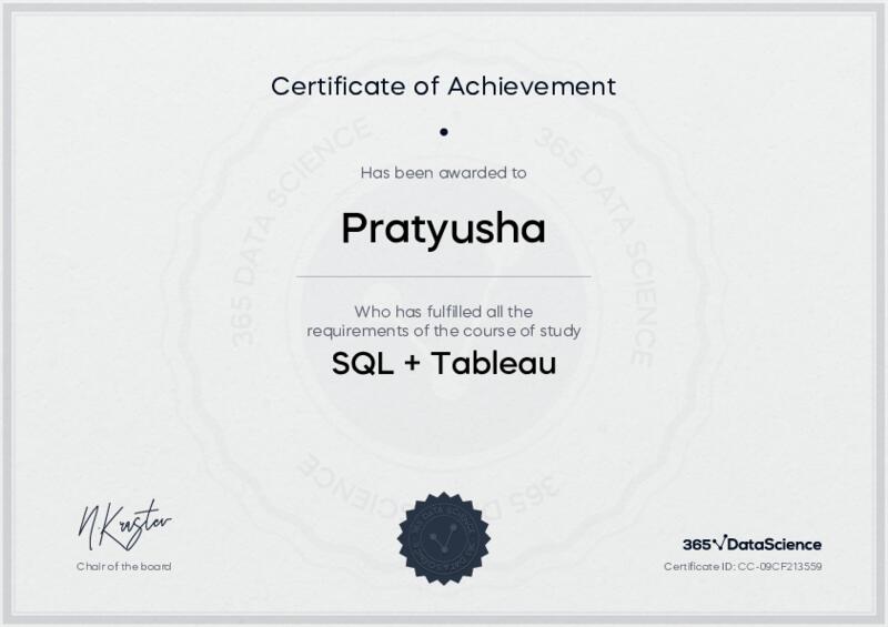 This user has been awarded the SQL + Tableau Certificate for successfully completing the course exam. Holding this certificate demonstrates their proficiency on the topic and signifies they are qualified to apply their newly acquired expertise in the fields of data analytics and data science.