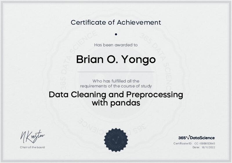 This user has been awarded the Data Cleaning and Preprocessing with pandas Certificate for successfully completing the course exam. Holding this certificate demonstrates their proficiency on the topic and signifies they are qualified to apply their newly acquired expertise in the fields of data analytics and data science.