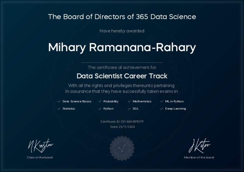 This user has been awarded the Data Scientist Career Track Certificate for successfully completing all courses and assessments. This certificate confirms their technical expertise and professional credibility to work as a data scientist.