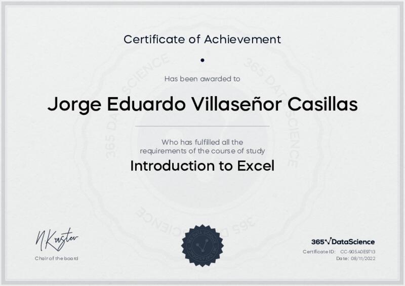 This user has been awarded the Introduction to Excel Certificate for successfully completing the course exam. Holding this certificate demonstrates their proficiency on the topic and signifies they are qualified to apply their newly acquired expertise in the fields of data analytics and data science.