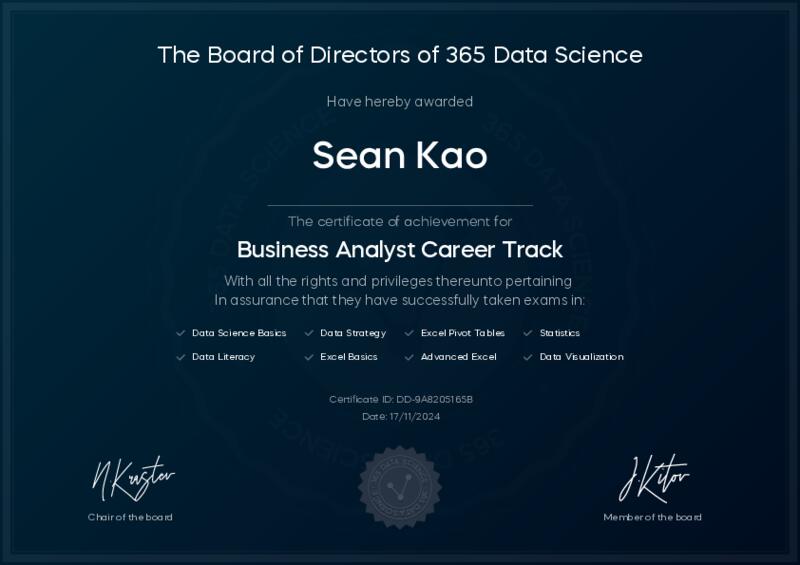 This user has been awarded the Business Analyst Career Track Certificate for successfully completing all courses and assessments. This certificate confirms their technical expertise and professional credibility to work as a business analyst.
