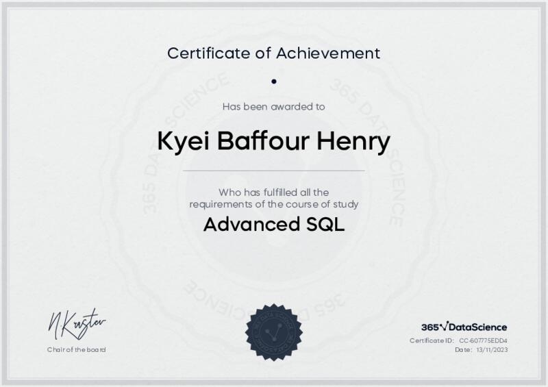 This user has been awarded the Advanced SQL Certificate for successfully completing the course exam. Holding this certificate demonstrates their proficiency on the topic and signifies they are qualified to apply their newly acquired expertise in the fields of data analytics and data science.