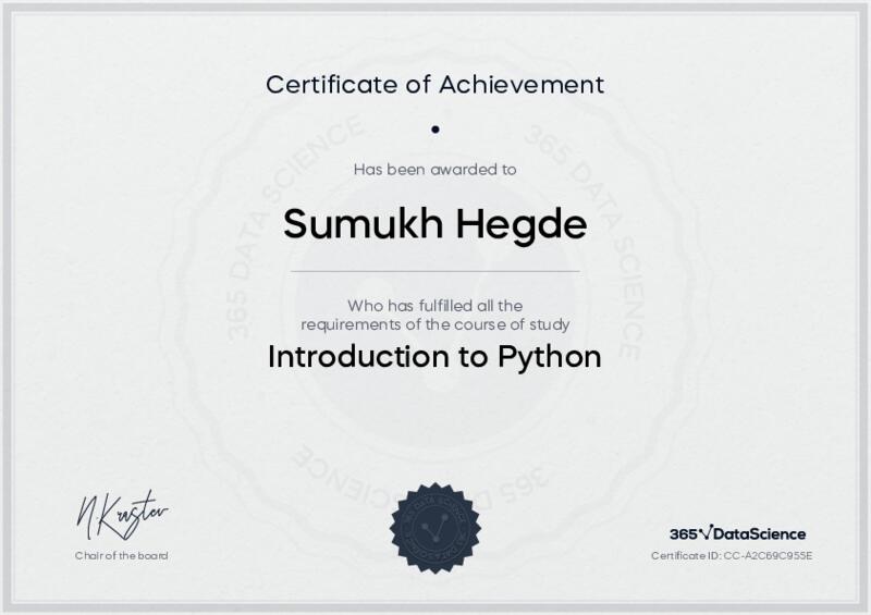 This user has been awarded the Introduction to Python Certificate for successfully completing the course exam. Holding this certificate demonstrates their proficiency on the topic and signifies they are qualified to apply their newly acquired expertise in the fields of data analytics and data science.