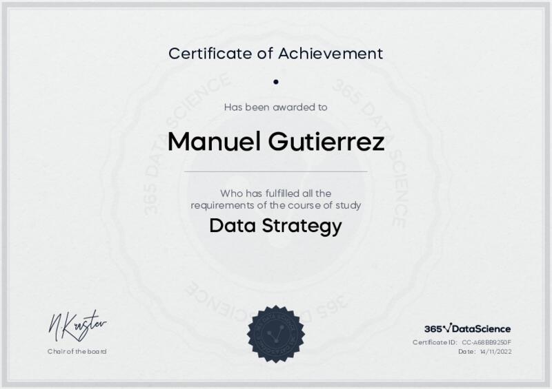 This user has been awarded the Data Strategy Certificate for successfully completing the course exam. Holding this certificate demonstrates their proficiency on the topic and signifies they are qualified to apply their newly acquired expertise in the fields of data analytics and data science.