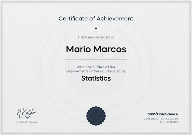 This user has been awarded the Statistics Certificate for successfully completing the course exam. Holding this certificate demonstrates their proficiency on the topic and signifies they are qualified to apply their newly acquired expertise in the fields of data analytics and data science.