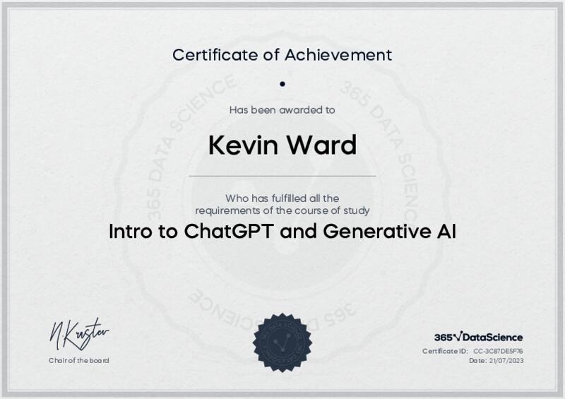This user has been awarded the Intro to ChatGPT and Generative AI Certificate for successfully completing the course exam. Holding this certificate demonstrates their proficiency on the topic and signifies they are qualified to apply their newly acquired expertise in the fields of data analytics and data science.
