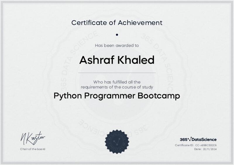 This user has been awarded the Python Programmer Bootcamp Certificate for successfully completing the course exam. Holding this certificate demonstrates their proficiency on the topic and signifies they are qualified to apply their newly acquired expertise in the fields of data analytics and data science.