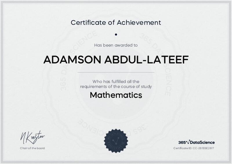 This user has been awarded the Mathematics Certificate for successfully completing the course exam. Holding this certificate demonstrates their proficiency on the topic and signifies they are qualified to apply their newly acquired expertise in the fields of data analytics and data science.