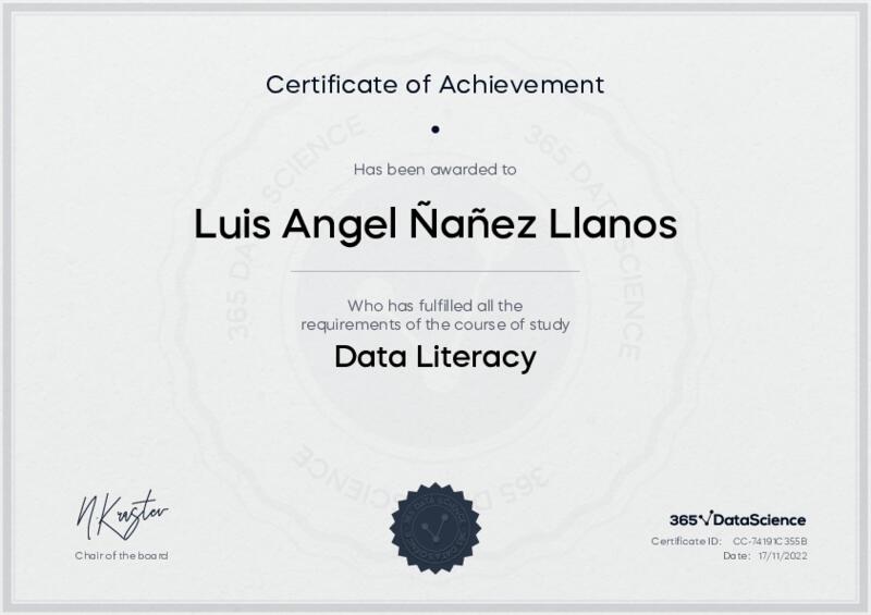 This user has been awarded the Data Literacy Certificate for successfully completing the course exam. Holding this certificate demonstrates their proficiency on the topic and signifies they are qualified to apply their newly acquired expertise in the fields of data analytics and data science.