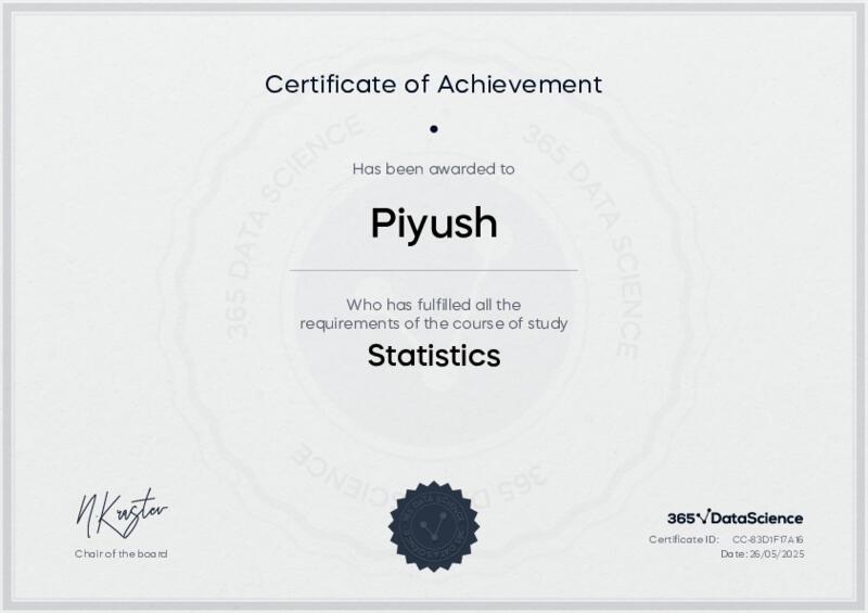 This user has been awarded the Statistics Certificate for successfully completing the course exam. Holding this certificate demonstrates their proficiency on the topic and signifies they are qualified to apply their newly acquired expertise in the fields of data analytics and data science.