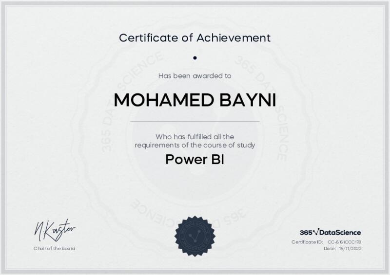 This user has been awarded the Power BI Certificate for successfully completing the course exam. Holding this certificate demonstrates their proficiency on the topic and signifies they are qualified to apply their newly acquired expertise in the fields of data analytics and data science.