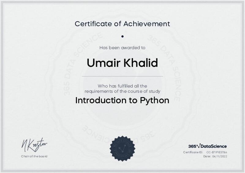 This user has been awarded the Introduction to Python Certificate for successfully completing the course exam. Holding this certificate demonstrates their proficiency on the topic and signifies they are qualified to apply their newly acquired expertise in the fields of data analytics and data science.