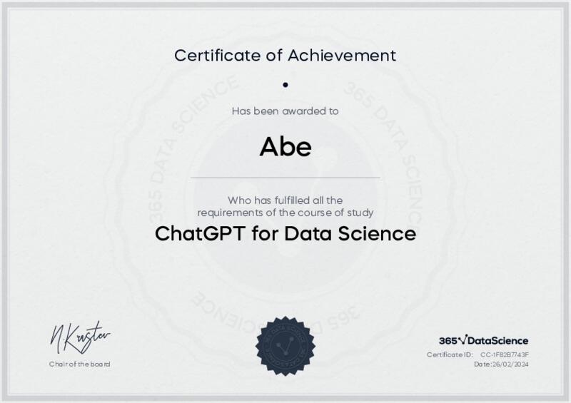 This user has been awarded the ChatGPT for Data Science Certificate for successfully completing the course exam. Holding this certificate demonstrates their proficiency on the topic and signifies they are qualified to apply their newly acquired expertise in the fields of data analytics and data science.