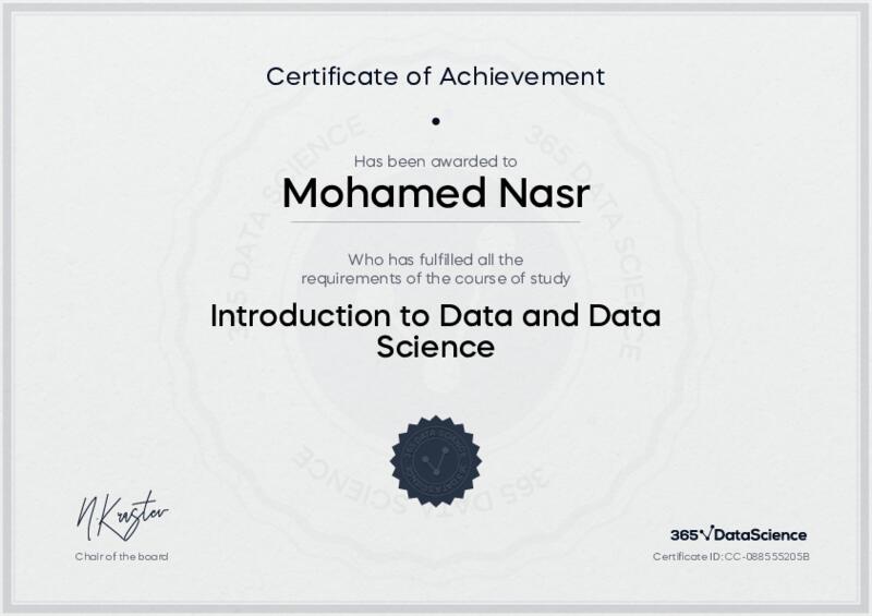 This user has been awarded the Introduction to Data and Data Science Certificate for successfully completing the course exam. Holding this certificate demonstrates their proficiency on the topic and signifies they are qualified to apply their newly acquired expertise in the fields of data analytics and data science.