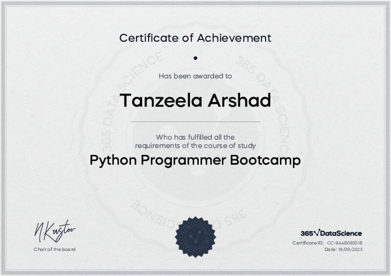 This user has been awarded the Python Programmer Bootcamp Certificate for successfully completing the course exam. Holding this certificate demonstrates their proficiency on the topic and signifies they are qualified to apply their newly acquired expertise in the fields of data analytics and data science.