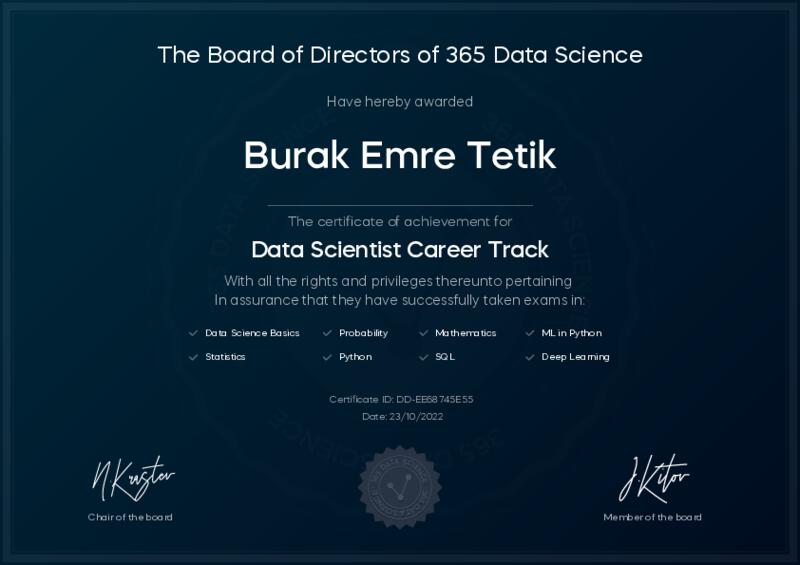 This user has been awarded the Data Scientist Career Track Certificate for successfully completing all courses and assessments. This certificate confirms their technical expertise and professional credibility to work as a data scientist.