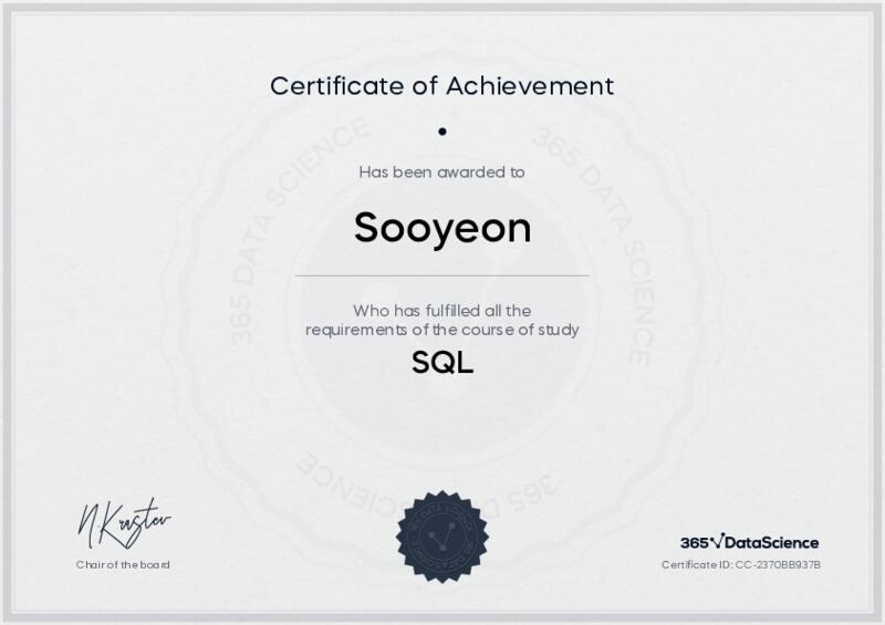 This user has been awarded the SQL Certificate for successfully completing the course exam. Holding this certificate demonstrates their proficiency on the topic and signifies they are qualified to apply their newly acquired expertise in the fields of data analytics and data science.