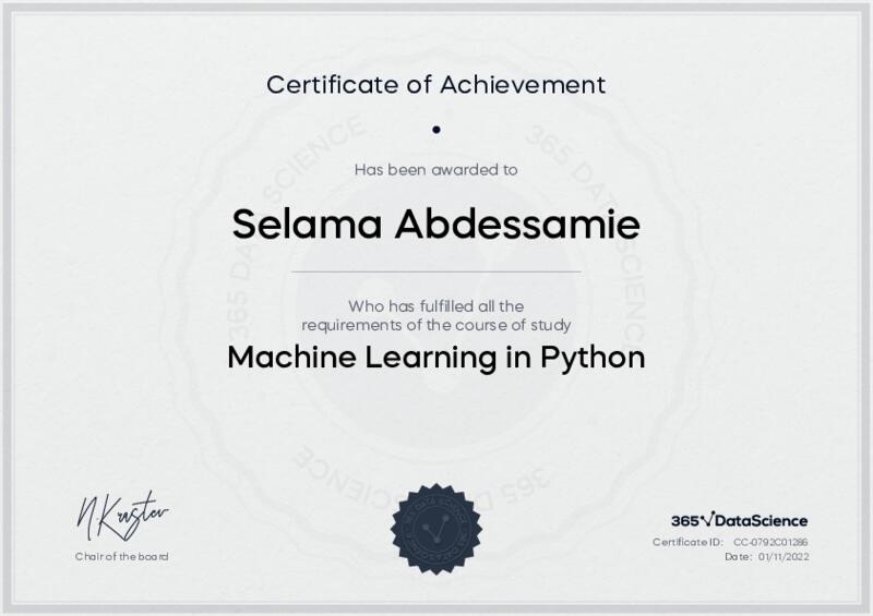 This user has been awarded the Machine Learning in Python Certificate for successfully completing the course exam. Holding this certificate demonstrates their proficiency on the topic and signifies they are qualified to apply their newly acquired expertise in the fields of data analytics and data science.