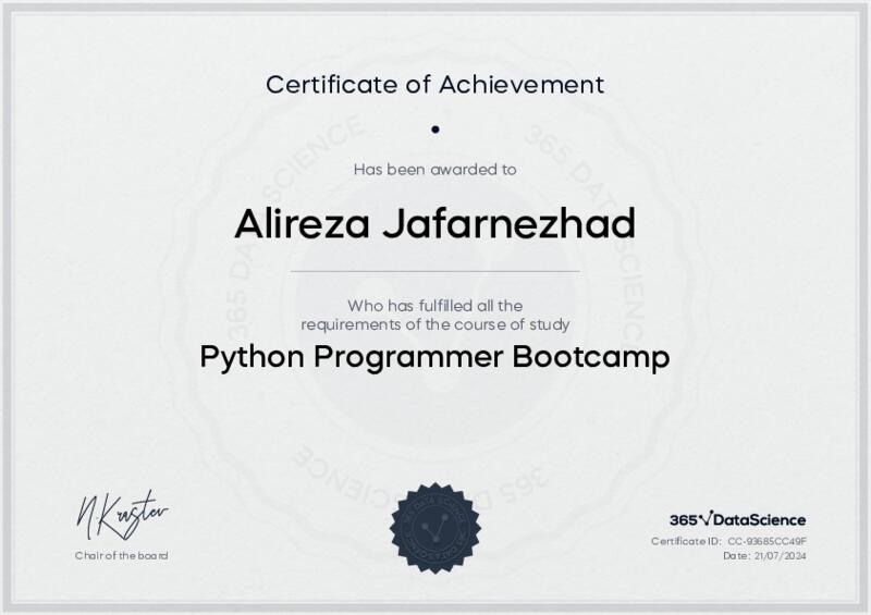 This user has been awarded the Python Programmer Bootcamp Certificate for successfully completing the course exam. Holding this certificate demonstrates their proficiency on the topic and signifies they are qualified to apply their newly acquired expertise in the fields of data analytics and data science.