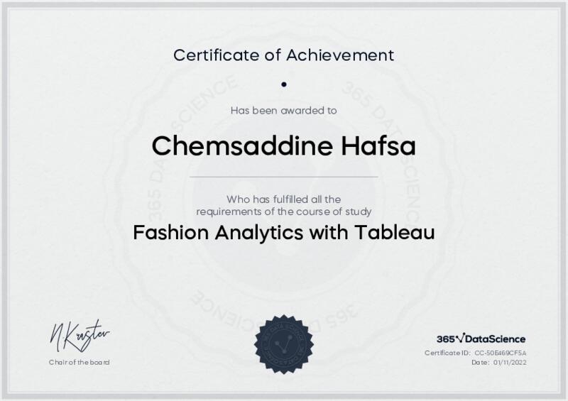 This user has been awarded the Fashion Analytics with Tableau Certificate for successfully completing the course exam. Holding this certificate demonstrates their proficiency on the topic and signifies they are qualified to apply their newly acquired expertise in the fields of data analytics and data science.