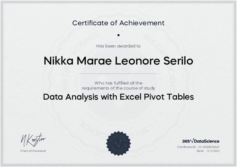 This user has been awarded the Data Analysis with Excel Pivot Tables Certificate for successfully completing the course exam. Holding this certificate demonstrates their proficiency on the topic and signifies they are qualified to apply their newly acquired expertise in the fields of data analytics and data science.