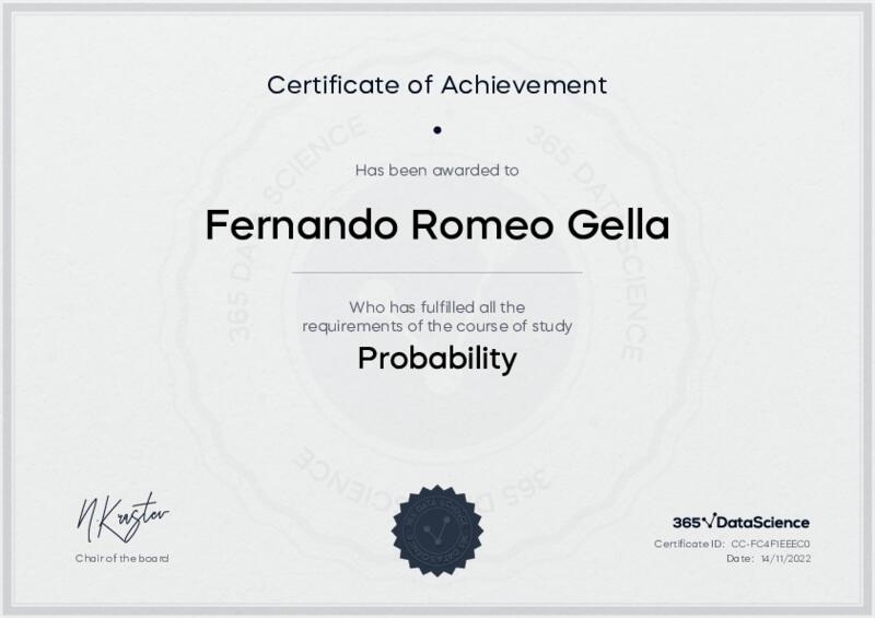 This user has been awarded the Probability Certificate for successfully completing the course exam. Holding this certificate demonstrates their proficiency on the topic and signifies they are qualified to apply their newly acquired expertise in the fields of data analytics and data science.