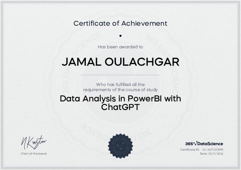 This user has been awarded the Data Analysis in PowerBI with ChatGPT Certificate for successfully completing the course exam. Holding this certificate demonstrates their proficiency on the topic and signifies they are qualified to apply their newly acquired expertise in the fields of data analytics and data science.
