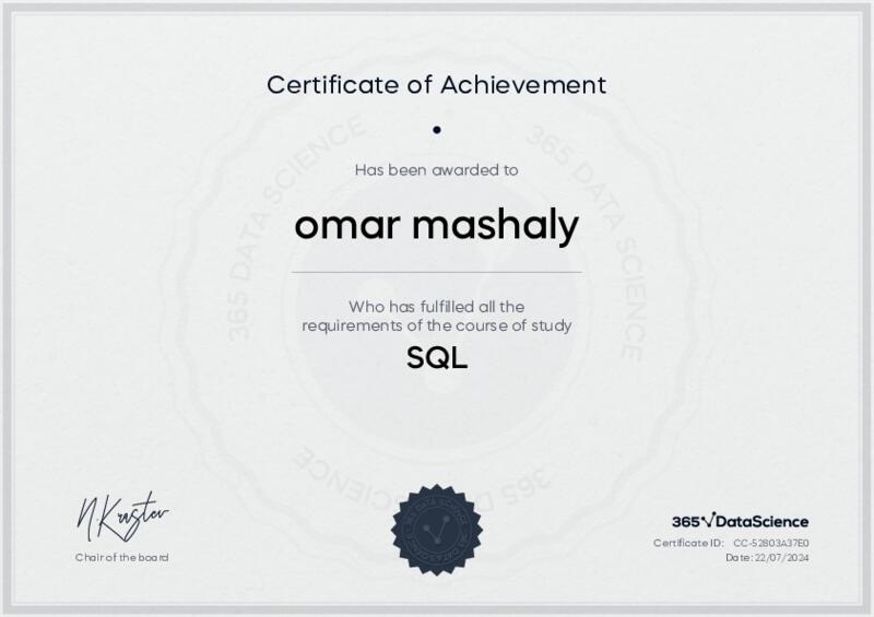 This user has been awarded the SQL Certificate for successfully completing the course exam. Holding this certificate demonstrates their proficiency on the topic and signifies they are qualified to apply their newly acquired expertise in the fields of data analytics and data science.