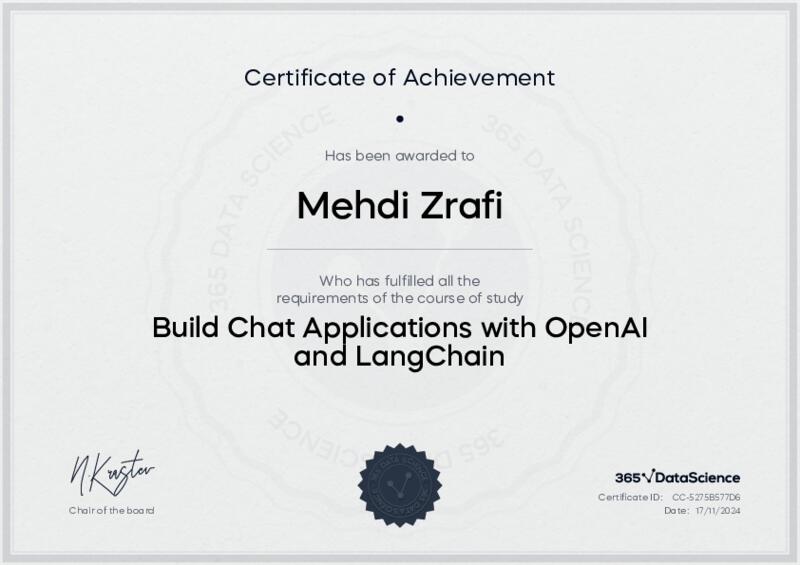This user has been awarded the Build Chat Applications with OpenAI and LangChain Certificate for successfully completing the course exam. Holding this certificate demonstrates their proficiency on the topic and signifies they are qualified to apply their newly acquired expertise in the fields of data analytics and data science.