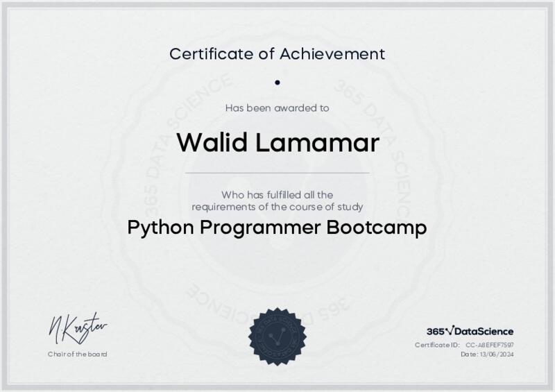 This user has been awarded the Python Programmer Bootcamp Certificate for successfully completing the course exam. Holding this certificate demonstrates their proficiency on the topic and signifies they are qualified to apply their newly acquired expertise in the fields of data analytics and data science.