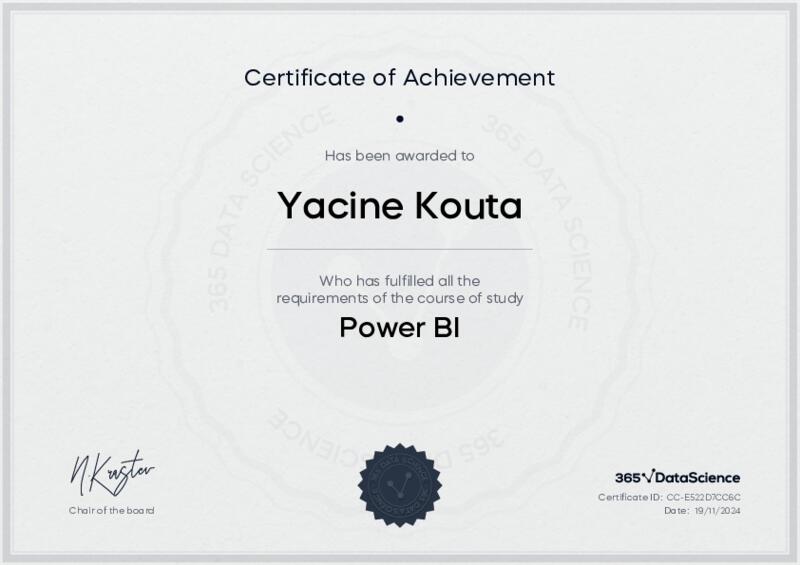 This user has been awarded the Power BI Certificate for successfully completing the course exam. Holding this certificate demonstrates their proficiency on the topic and signifies they are qualified to apply their newly acquired expertise in the fields of data analytics and data science.