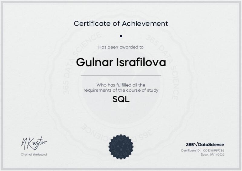 This user has been awarded the SQL Certificate for successfully completing the course exam. Holding this certificate demonstrates their proficiency on the topic and signifies they are qualified to apply their newly acquired expertise in the fields of data analytics and data science.