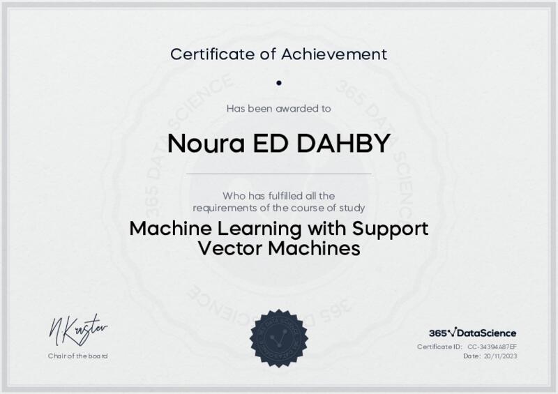 This user has been awarded the Machine Learning with Support Vector Machines Certificate for successfully completing the course exam. Holding this certificate demonstrates their proficiency on the topic and signifies they are qualified to apply their newly acquired expertise in the fields of data analytics and data science.