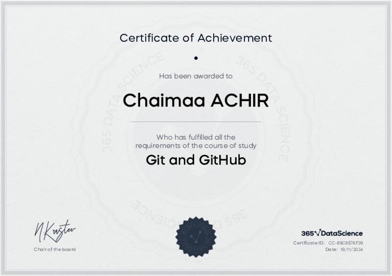 This user has been awarded the Git and GitHub Certificate for successfully completing the course exam. Holding this certificate demonstrates their proficiency on the topic and signifies they are qualified to apply their newly acquired expertise in the fields of data analytics and data science.