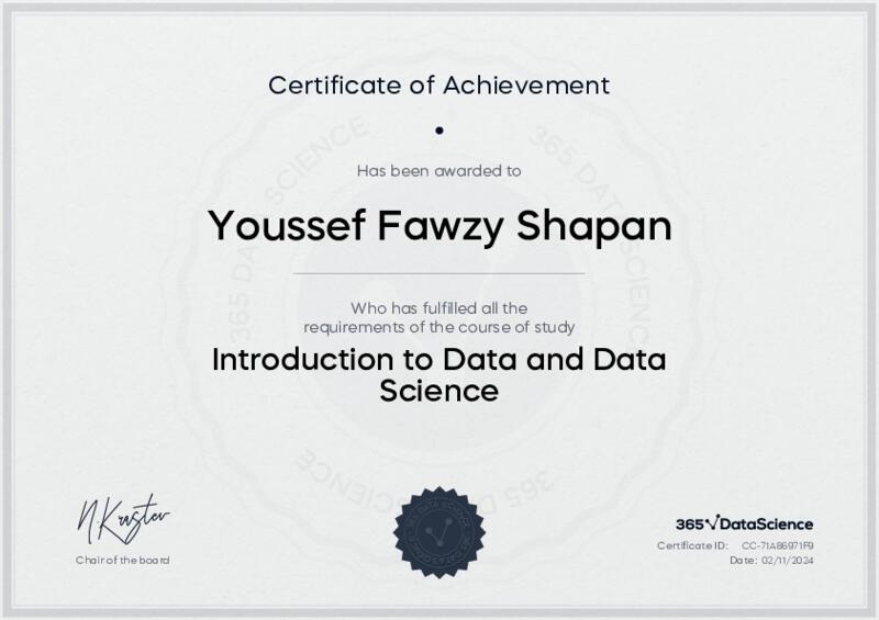 This user has been awarded the Introduction to Data and Data Science Certificate for successfully completing the course exam. Holding this certificate demonstrates their proficiency on the topic and signifies they are qualified to apply their newly acquired expertise in the fields of data analytics and data science.