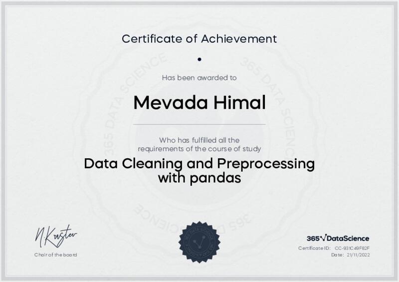 This user has been awarded the Data Cleaning and Preprocessing with pandas Certificate for successfully completing the course exam. Holding this certificate demonstrates their proficiency on the topic and signifies they are qualified to apply their newly acquired expertise in the fields of data analytics and data science.