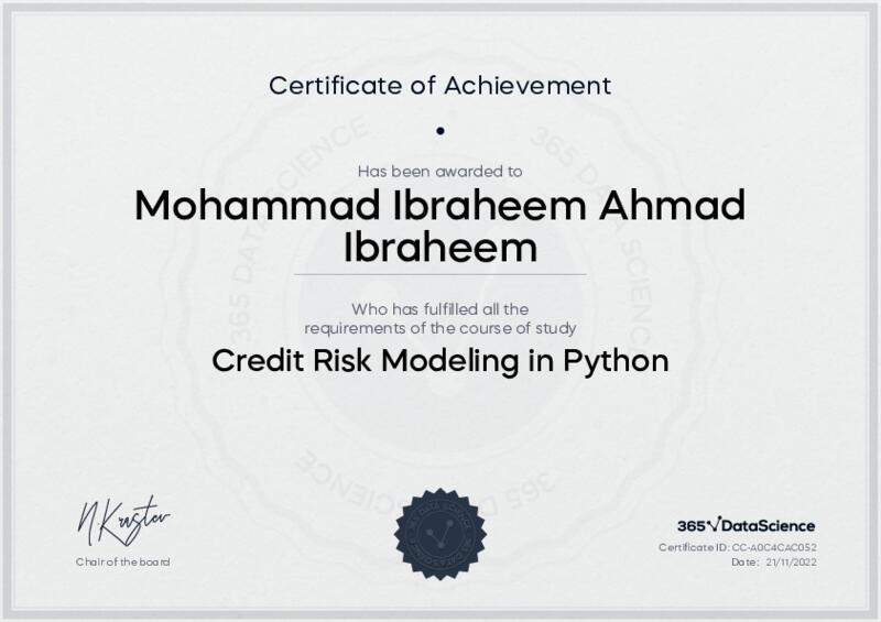 This user has been awarded the Credit Risk Modeling in Python Certificate for successfully completing the course exam. Holding this certificate demonstrates their proficiency on the topic and signifies they are qualified to apply their newly acquired expertise in the fields of data analytics and data science.