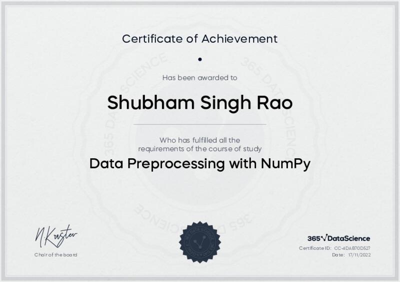 This user has been awarded the Data Preprocessing with NumPy Certificate for successfully completing the course exam. Holding this certificate demonstrates their proficiency on the topic and signifies they are qualified to apply their newly acquired expertise in the fields of data analytics and data science.