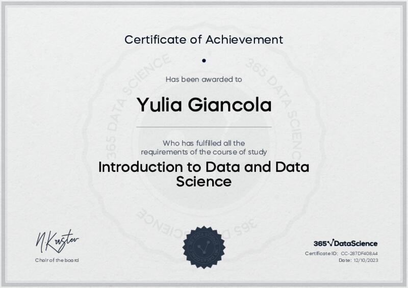This user has been awarded the Introduction to Data and Data Science Certificate for successfully completing the course exam. Holding this certificate demonstrates their proficiency on the topic and signifies they are qualified to apply their newly acquired expertise in the fields of data analytics and data science.