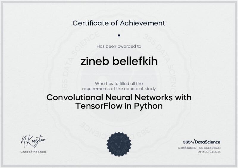 This user has been awarded the Convolutional Neural Networks with TensorFlow in Python Certificate for successfully completing the course exam. Holding this certificate demonstrates their proficiency on the topic and signifies they are qualified to apply their newly acquired expertise in the fields of data analytics and data science.