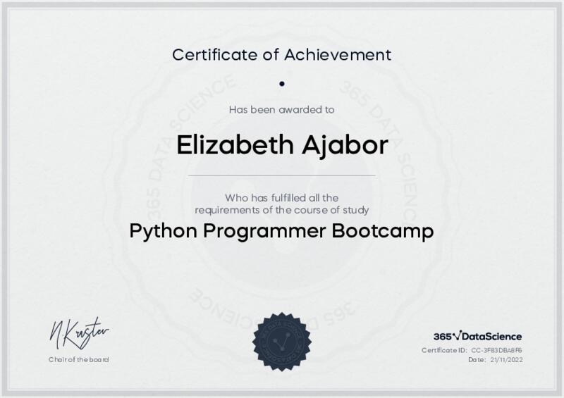 This user has been awarded the Python Programmer Bootcamp Certificate for successfully completing the course exam. Holding this certificate demonstrates their proficiency on the topic and signifies they are qualified to apply their newly acquired expertise in the fields of data analytics and data science.