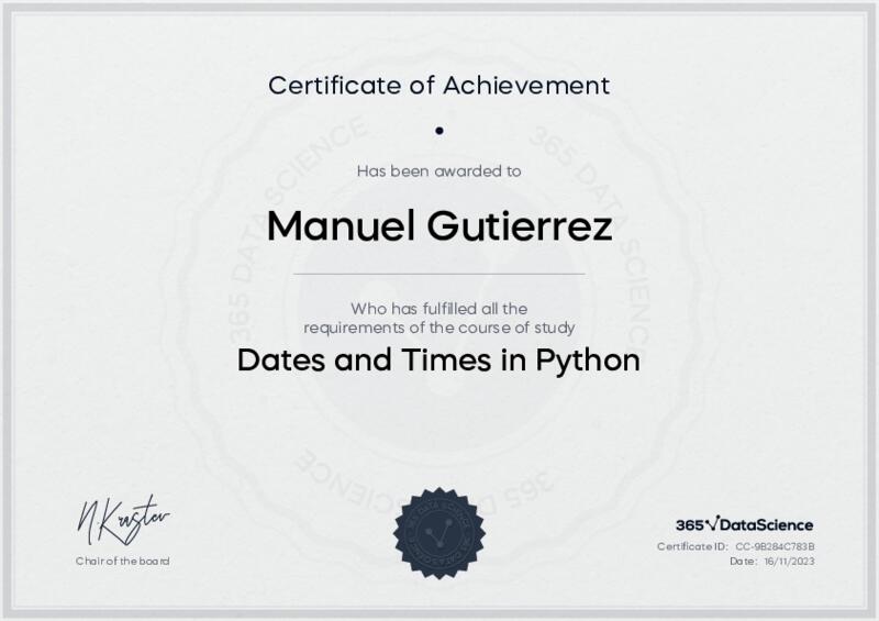 This user has been awarded the Dates and Times in Python Certificate for successfully completing the course exam. Holding this certificate demonstrates their proficiency on the topic and signifies they are qualified to apply their newly acquired expertise in the fields of data analytics and data science.