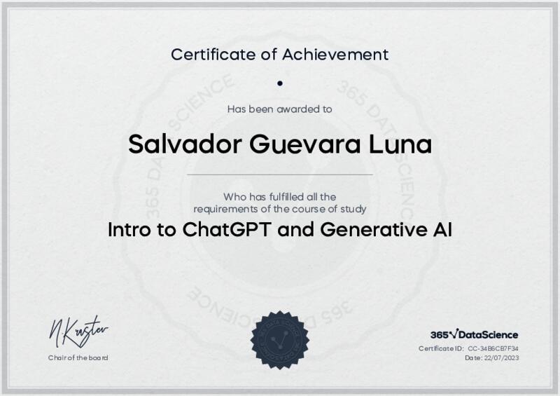 This user has been awarded the Intro to ChatGPT and Generative AI Certificate for successfully completing the course exam. Holding this certificate demonstrates their proficiency on the topic and signifies they are qualified to apply their newly acquired expertise in the fields of data analytics and data science.