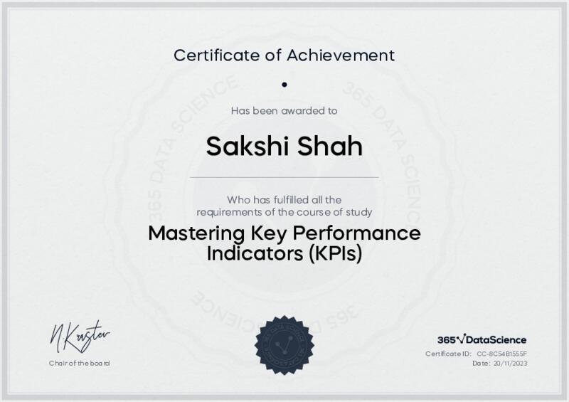 This user has been awarded the Mastering Key Performance Indicators (KPIs) Certificate for successfully completing the course exam. Holding this certificate demonstrates their proficiency on the topic and signifies they are qualified to apply their newly acquired expertise in the fields of data analytics and data science.