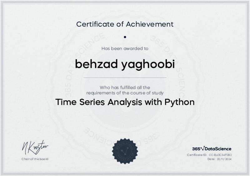This user has been awarded the Time Series Analysis with Python Certificate for successfully completing the course exam. Holding this certificate demonstrates their proficiency on the topic and signifies they are qualified to apply their newly acquired expertise in the fields of data analytics and data science.
