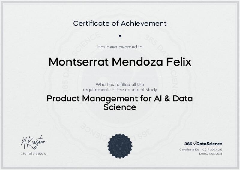 This user has been awarded the Product Management for AI & Data Science Certificate for successfully completing the course exam. Holding this certificate demonstrates their proficiency on the topic and signifies they are qualified to apply their newly acquired expertise in the fields of data analytics and data science.