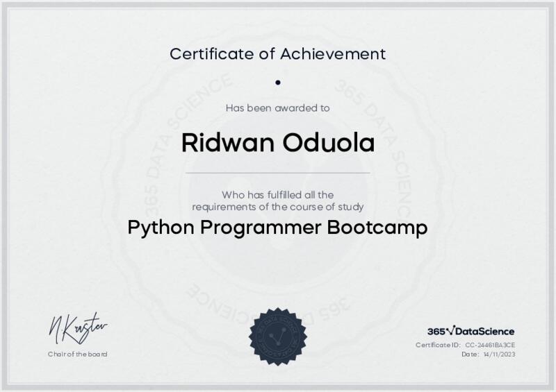 This user has been awarded the Python Programmer Bootcamp Certificate for successfully completing the course exam. Holding this certificate demonstrates their proficiency on the topic and signifies they are qualified to apply their newly acquired expertise in the fields of data analytics and data science.