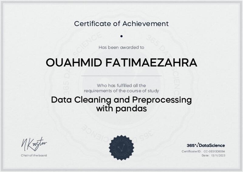 This user has been awarded the Data Cleaning and Preprocessing with pandas Certificate for successfully completing the course exam. Holding this certificate demonstrates their proficiency on the topic and signifies they are qualified to apply their newly acquired expertise in the fields of data analytics and data science.